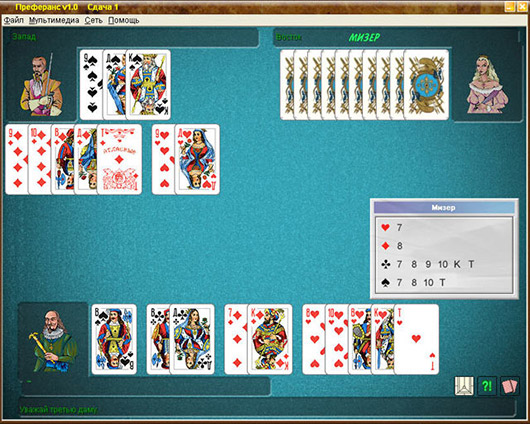 Игра "Преферанс" создана так, чтобы любой мог не только быстро понять правила этой классической карточной игры, но и найти себе достойного соперника. Для новичков существует подробная обучающая справка и игровой режим с подсказками, а для опытных игроков - возможность выбора конвенций любой сложности, умных компьютерных противников, а также режим "Решатель задач", где вы сможете составить и разыграть интересные расклады.